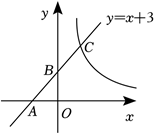 如图,在平面直角坐标系中,直线 $y=x+3$ 与 $x$ 轴,$y$ 轴分别交于点 $A, B$ ,与反比例函数 $\mathrm{y}=\frac{\mathrm{k}}{\mathrm{x}} (k \neq 0$ 且 $x>0)$ 的图象在第一象限交于点 $C$ ,若 $A B=B C$ .