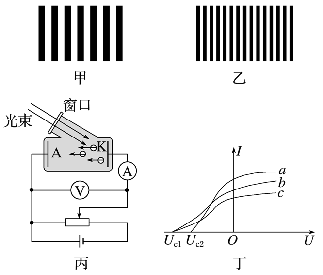 如图所示,甲、乙为两束光经过同一双缝干涉装置后产生的干涉条纹,丙图为光电效应实验图,实验中施加反向电压得到的光电流 $I$ 与光电管两端电压 $U$ 的关系如图丁所示,下列说法正确的是