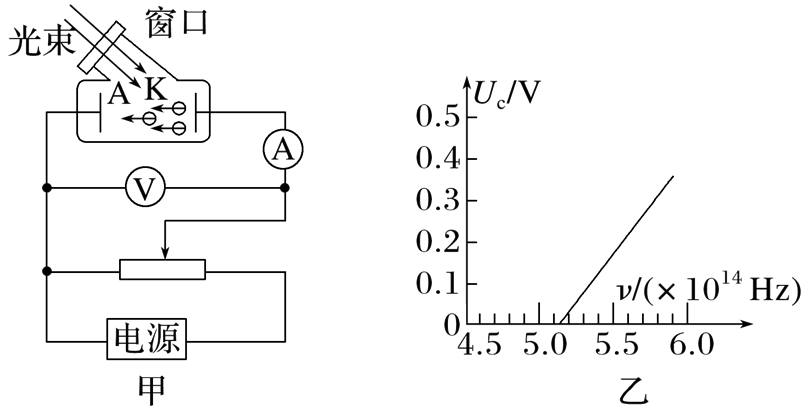 用金属铷为阴极的光电管,观测光电效应现象,实验装置示意图如图甲所示,实验中测得铝的遏止电压 $U_{\mathrm{c}}$ 与入射光频率 $v$ 之间的关系如图乙所示,图线与横轴交点的横坐标为 $5.15 \times 10^{14} \mathrm{~Hz}$ .已知普朗克常量 $h=6.63 \times 10^{-34} \mathrm{~J} \cdot \mathrm{~s}$ .则下列说法中正确的是