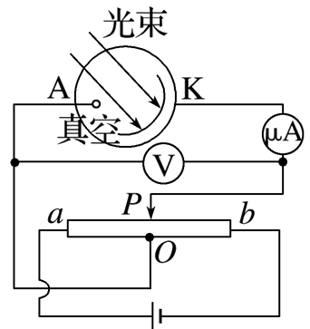 如图所示为研究光电效应的实验装置,此时滑片 $P$ 位于中点 $O$ 的正上方,用光束照射光电管的极板 K ,电流表的指针发生偏转。移动滑片 $P$ ,当电流表示数恰好为 0 时,电压表指针指向某一刻度,下列说法正确的是