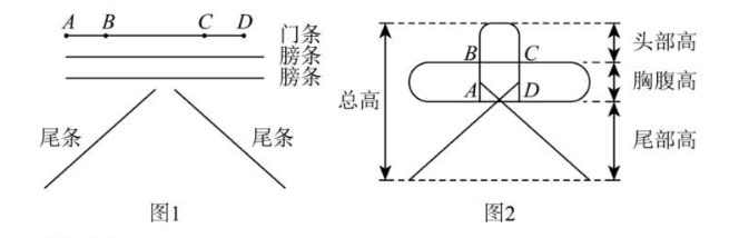 北京风筝制作技艺是国家级非物质文化遗产.为制作一只京燕风筝,小明准备了五根直竹条(如图 1):一根门条、两根等长的膀条和两根等长的尾条.他将门条和膀条分别烤弯后与尾条一起扎成风筝的骨架(如图2),其头部高、胸腹高与尾部高的比是 $1: 1: 2$ .已知单根膀条长是胸腹高的 5 倍,门条比单根膀条短 10 cm ,图 1 中 $B C$ 的长是门条长的 $\frac{5}{9}, A B, C D$的长均等于胸腹高.求这只风筝的骨架的总高.