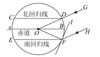 如图,$\odot O$ 是地球的示意图,其中 $A B$ 表示赤道,$C D, E F$ 分别表示北回归线和南回归线,$\angle D O B=\angle F O B=23.5^{\circ}$ .夏至日正午时,太阳光线 $G D$ 所在直线经过地心 $O$ ,此时点 $F$处的太阳高度角 $\triangle I F H$(即平行于 $G D$ 的光线 $H F$ 与 $\odot O$ 的切线 $F I$ 所成的锐角)的大小为 ${ }^{\circ}$ .