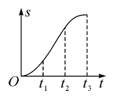 一质量为 $m$ 的乘客乘坐坚直电梯下楼,其位移 $s$ 与时间 $t$ 的关系图像如图所示。其中 $t_1 \sim t_2$ 段 $s-t$ 图像是直线,乘客所受支持力的大小用 $F_N$ 表示,速度大小用 $v$ 表示。重力加速度大小为 $g$ 。以下判断正确的是