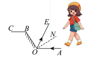 如图为小颖在试鞋镜前的光路图,入射光线 $O A$ 经平面镜后反射入眼,若 $C B / / O A, \angle C B O=122^{\circ}$ , $\angle B O N=90^{\circ}$ ,则入射角 $\angle A O N$ 的度数为