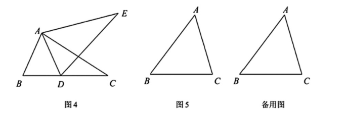 【方法应用】 ① 如图4,将 $\mathrm{V} A B C$ 绕点 A 逆时针旋转至 $\mathrm{V} A D E$ ,点 $D$ 恰好落在 $B C$ 边上,求证:四边形 $A B D E$ 是双等四边形.