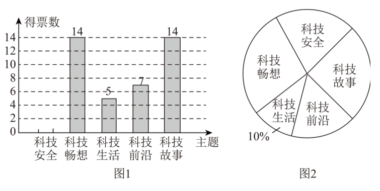 某班级拟开展科技主题班会活动,现从"科技安全","科技畅想","科技生活","科技前沿","科技故事"中挑选一个主题。全班同学通过投票选出最受欢迎的主题,投票结果的条形统计图与扇形统计图如下: