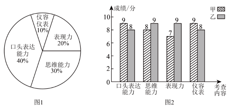 某班需从甲、乙两名同学中推荐一人参加校史馆讲解员的选拔,班委决定从口头表达能力、思维能力、表现力、仪容仪表四项内容进行考查.全班同学投票确定了各项所占的百分比,结果如图1,再对甲、乙进行考查并逐项打分,成绩如图 2 .
