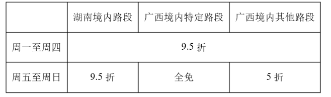 自 2025年5月9日起至2025年12月31日,周末自驾游广西的外省籍小客车,可享受高速公路车辆通行费(以下简称高速费)优惠。 小悦一家 5 月中旬从湖南自驾到广西探亲游玩,此次全程所产生的高速费享受的优惠如下: