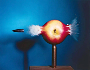 图示为高速摄影机拍摄到的子弹穿过苹果瞬间的照片.该照片经过放大后分析出,在曝光时间内,子弹影像前后错开的距离约为子弹长度的 $1 \% \sim 2 \%$ .已知子弹飞行速度约为 $500 \mathrm{~m} / \mathrm{s}$ ,因此可估算出这幅照片的曝光时间最接近