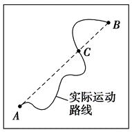 如图所示,某赛车手在一次野外训练中,先用地图计算出出发地 $A$ 和目的地 $B$ 的直线距离为 9 km ,实际从 $A$ 运动到 $B$ 用时 5 min ,赛车上的里程表指示的里程数是 15 km ,当他经过某路标 $C$ 时,车内速度计指示的示数为 $150 \mathrm{~km} / \mathrm{h}$ ,那么可以确定的是( )
