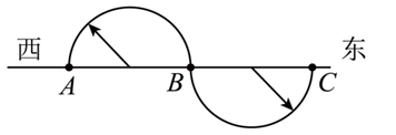 如图所示,物体沿两个半径为 $R$ 的半圆弧由 $A$ 经 $B$ 运动到 $C$ ,则它的位移和路程分别是