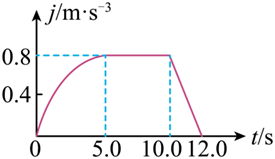 宇航员的训练、竞技体育的指导、汽车和电梯的设计等多种工作都用到急动度的概念,急动度 $j$ 是描述加速度 $a$ 随时间 $t$ 变化快慢的物理量,即 $j=\frac{\Delta a}{\Delta t}$ ,它可以用来反映乘客乘坐交通工具时的舒适程度,当交通工具的急动度为零时乘客感觉最舒适。如图所示为某新能源汽车从静止开始启动的一小段时间内的急动度 $j$ 随时间 $t$ 变化的规律。下列说法正确的是