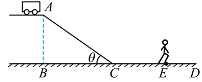 在寒冷的冬天,路面很容易结冰,在冰雪路面上汽车一定要低速行驶。在冰雪覆盖的路面上,车辆遇紧急情况刹车时,车轮会抱死而"打滑"。如图所示,设某汽车以 $36 \mathrm{~km} / \mathrm{h}$ 的速度行驶至一斜坡的顶端 $A$ 时,突然发现坡底前方有一行人正以 $2 \mathrm{~m} / \mathrm{s}$ 的速度同向匀速行驶,司机立即刹车,但因冰雪路面太滑,汽车仍沿斜坡滑下。已知斜坡倾角 $\theta=37^{\circ}\left(\sin 37^{\circ}=0.6, \cos 37^{\circ}=0.8\right)$ ,斜坡长 $s_{A C}=11 \mathrm{~m}$ ,司机刹车时行人距坡底 $C$ 点距离 $s_{C E}=7 \mathrm{~m}$ ,从厂家的技术手册中查得该车轮胎与冰雪路面的动摩擦因数约为 0.5 ,假设斜坡与水平路面平滑连接,司机从 C 点进入水平路面时速率不变,$g$ 取 $10 \mathrm{~m} / \mathrm{s}^2$ 。求: