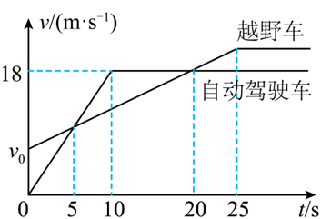 已知国产越野车和自动驾驶车都在同一公路上向东行驶,自动驾驶车由静止开始运动时,越野车刚好以速度 $v_0$ 从旁边加速驶过,如图所示的粗折线和细折线分别是越野车和自动驾驶车的 $v-t$ 图线,根据这些信息,可以判断