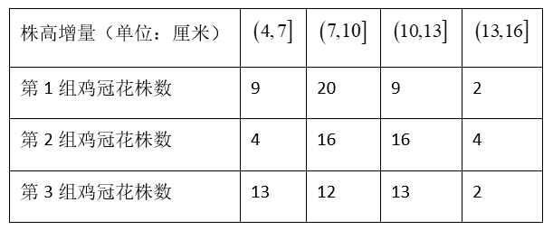 某高校“植物营养学专业”学生将鸡冠花的株高增量作为研究对象,观察长效肥和缓释肥对农作物影响情况.其中长效肥、缓释肥、未施肥三种处理下的鸡冠花分别对应1,2,3三组.观察一段时间后,分别从1,2,3三组随机抽取40株鸡冠花作为样本,得到相应的株高增量数据整理如下表.