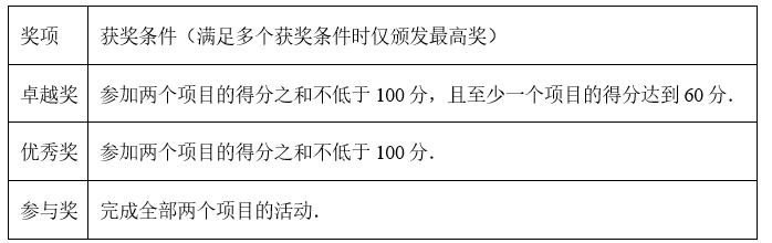 学校开展“健康小达人”主题活动,活动分为“耐力挑战”和“技巧闯关”两个项目,活动结束后根据两个项目的得分进行颁奖.评奖规则为