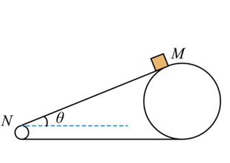 (2)某次水平抛射速度不够大,物品经过 $M$ 点,求此时物品速度的方向与水平方向间夹角的正切值;