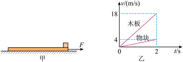 如图甲所示,一定长度、质量为 $M=2 \mathrm{~kg}$ 的长木板放在水平面上,质量为 $m=1 \mathrm{~kg}$ 且可视为质点的物块放在长木板的最右端,现在长木板上施加一水平向右的外力 $F_l$(大小未知),使长木板和物块均由静止开始运动,将此刻记为 $t=0$ 时刻, $0 \sim 2 \mathrm{~s}$ 内长木板和物块的速度随时间的变化规律如图乙所示,$t_0=2 \mathrm{~s}$ 时将外力大小改为 $F_2=22 \mathrm{~N}$ ,物块与长木板间的动摩擦因数为 $\mu_1$ ,长木板与水平面间的动摩擦因数为 $\mu_2=\frac{11}{15}$ ,假设最大静摩擦力等于滑动摩擦力,整个过程中物块始终未离开长木板,重力加速度 $g=10 \mathrm{~m} / \mathrm{s}^2$ 求: