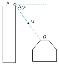 如图所示,从一高楼顶部向一较低的平台水平拋射物品(可视为质点),已知拋出点 $P$ 和平台上 $Q$ 点的连线与水平方向夹角为 $53^{\circ}, P 、 Q$ 连线的长度为 $L=25 \mathrm{~m}, M$ 为 $P 、 Q$ 连线上的一点,重力加速度 $g=10 \mathrm{~m} / \mathrm{s}^2$ ,忽略空气阻力, $\sin 53^{\circ}=0.8, \cos 53^{\circ}=0.6$ 。