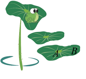 如图所示,青蛙先后两次从高处荷叶上的同一位置,跳到低处荷叶上 $A 、 B$ 两点,$A 、 B$ 在同一水平面内且 $A$点更靠近青蛙的起跳点。将青蛙的跳跃视为平抛运动,则