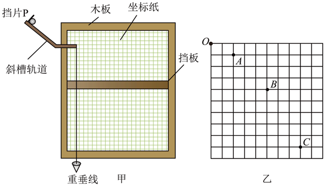 (2)正确操作后,获得如图乙所示的坐标纸。已知 $A 、 B 、 C$ 为小球做平抛运动经过的三个位置,结合平抛运动规律可判断出 $O$ 点 $\_\_\_\_$ (填"是"或"不是")小球做平抛运动轨迹上的一点。