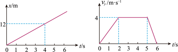 重庆"五一"期间举办了盛大的无人机灯光表演,千架无人机协同呈现出绚丽图案。将其中一架无人机的运动简化成坚直面内的运动,以水平向右为 $x$ 轴正方向,以坚直向上为 $y$ 轴正方向,水平方向无人机的位移 -时间图像以及坚直方向的速度-时间图像如图。下列说法正确的是