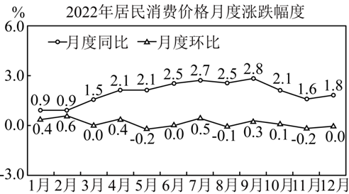 在统计学中,月度同比是指本月和上一年同月相比较的增长率,月度环比是指本月和上一个月相比较的增长率,如图是我国2022年1月至2022年12月居民消费价格月度涨跌幅度统计图,则以下说法正确的是