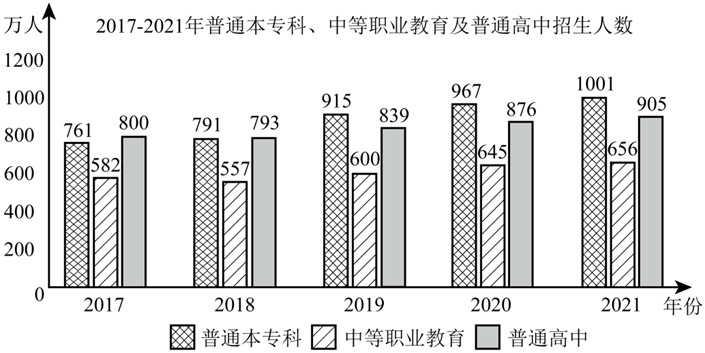 国家统计局公报显示绘制出的 2017-2021 年每年本专科、中等职业教育及普通高中的招生人数(单位:万)统计图如下图所示,则下列关于 2017-2021 年说法正确的是