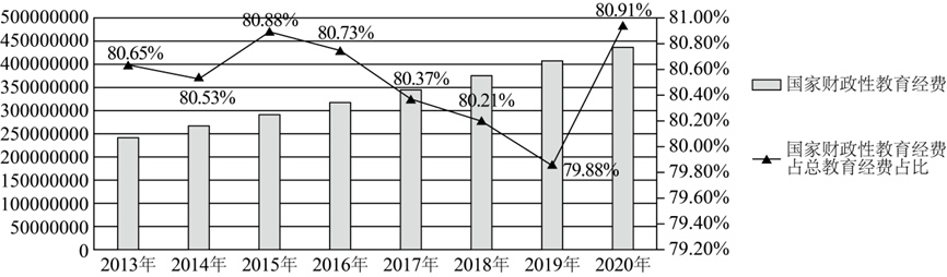下图是 2013-2020 年国家财政性教育经费(单位:万元)和国家财政性教育经费占总教育经费占比的统计图,下列说法正确的是( )