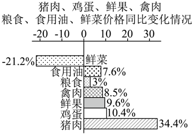 2022年11月,国内猪肉、鸡蛋、鲜果、禽肉、粮食、食用油、鲜菜价格同比(与去年同期相比)的变化情况如图所示,则下列说法正确的是