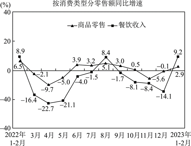 $\text{A.}$ 2023年1-2月份,商品零售总额同比增长 $9.2 \%$