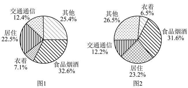 人均消费支出是社会需求的主体,是拉动经济增长们直接因素,是体现居民生活水平和质量的重要指标. 2022年一季度和 2023 年一季度我国居民人均消费支出分别为 6393 元和 6738 元,图1、图2分别为 2022 年一季度和 2023 年一季度居民人均消费支出构成分布图,则