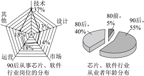 $\text{D.}$ 芯片、软件行业中," 90 后"从事市场岗位的人数比" 80 前"的总人数多