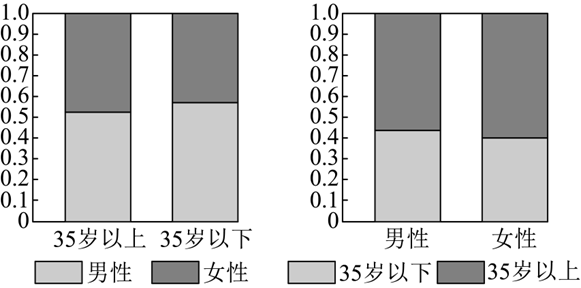 某调查机构抽取了部分关注济南地铁建设的市民作为样本,分析其年龄和性别结构,并制作出如下等高条形图.根据图中( 35 岁以上含 35 岁)的信息,关于该样本的结论不一定正确的是