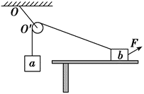 如图,一光滑的轻滑轮用细绳 $O O^{\prime}$ 悬挂于 $O$ 点;另一细绳跨过滑轮,其一端悬挂物块 $a$ ,另一端系一位于水平粗糙桌面上的物块 $b$ 。外力 $F$ 向右上方拉 $b$ ,整个系统处于静止状态。若 $F$ 方向不变,大小在一定范围内变化,物块 $b$ 仍始终保持静止,则()
