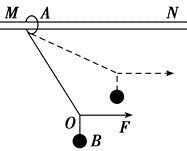 如图所示,轻绳的两端分别系在圆环 $A$ 和小球 $B$ 上,圆环 $A$ 套在粗糙的水平直杆 $M N$ 上.现用水平力 $F$ 拉着绳子上的一点 $O$ ,使小球 $B$ 从图中实线位置缓慢上升到虚线位置,但圆环 $A$ 始终保持在原位置不动.在这一过程中,环对杆的摩擦力 $F_{\mathrm{f}}$ 和环对杆的压力 $F_{\mathrm{N}}$ 的变化情况是
