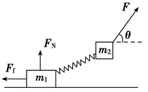如图所示,质量分别为 $m_1, m_2$ 的两个物体通过轻弹簧连接,在力 $F$ 的作用下一起沿水平方向做匀速直线运动( $m_1$ 在地面,$m_2$ 在空中),力 $F$ 与水平方向成 $\theta$ 角.则 $m_1$ 所受支持力 $F_{\mathrm{N}}$ 和摩擦力 $F_{\mathrm{f}}$ 正确的是( )