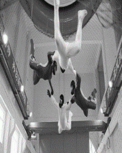 如图所示是我国首次立式风洞跳伞实验,风洞喷出坚直向上的气流将实验者加速向上"托起".此过程中