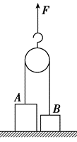 如图所示,物块 $A$ 和 $B$ 的质量分别为 $4 m$ 和 $m$ ,开始 $A 、 B$ 均静止,细绳拉直,在坚直向上拉力 $F=6 m g$ 作用下,动滑轮坚直向上加速运动。已知动滑轮质量忽略不计,动滑轮半径很小,不考虑绳与滑轮之间的摩擦,细绳足够长,在滑轮向上运动过程中,物块 $A$ 和 $B$ 的加速度分别为