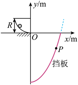 如图所示,以 $O$ 为原点在坚直面内建立平面直角坐标系:第IV象限挡板形状满足方程 $y=x^2-\frac{9}{4}$(单位: m ),小球从第II 象限内半径为 0.5 m 的四分之一光滑圆弧轨道某处由静止释放,通过 $O$ 点后开始做平抛运动,击中挡板上的 $P$ 点时速度最小,取重力加速度大小 $10 \mathrm{~m} / \mathrm{s}^2$ ,下列说法正确的是