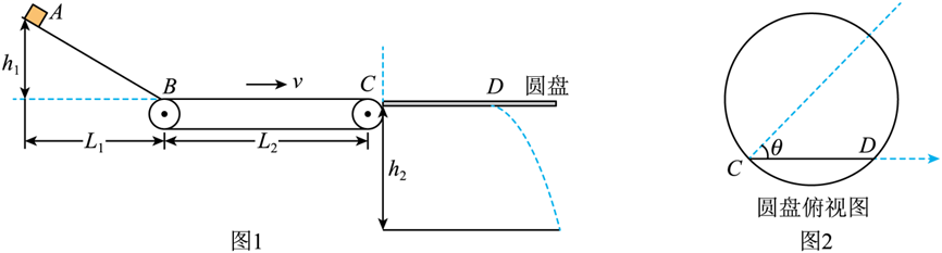 某传送装置的示意图如图 1 所示,整个装置由三部分组成,左侧为一倾斜直轨道,其顶端距离传送带平面的高度 $h_1=2.5 \mathrm{~m}$ ,其水平长度 $L_1=3.5 \mathrm{~m}$ 。中间是传送带其两轴心间距 $L_2=8 \mathrm{~m}$(传送带向右匀速传动,其速度 $v$ 大小可调),其右端为水平放置的圆盘。各连接处均在同一高度平滑对接。一质量为 $m=1 \mathrm{~kg}$ 的物块从倾斜直轨道的顶端由静止释放,物块经过传送带运动到圆盘上而后水平抛出,其中物块在圆盘上的运动轨迹为如图 2 中所示圆盘俯视图中的实线 $C D$ ,水平圆盘的半径为 5 m ,圆盘距离地面高度 $h_2=1.25 \mathrm{~m}$ 物块与倾斜直轨道和传送带间的动摩擦因数均为 $\mu_1=0.2$ ,与圆盘间的动摩擦因数 $\mu_2=0.5$ ,取重力加速度大小 $g=10 \mathrm{~m} / \mathrm{s}^2$ 。