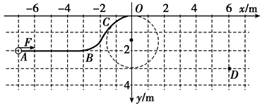 在坚直平面内固定一轨道 $A B C O, A B$ 段水平放置,长为 $4 \mathrm{~m}, B C O$ 段弯曲且光滑;一质量为 1.0 kg 、可视作质点的圆环套在轨道上,圆环与轨道 $A B$ 段之间的动摩擦因数为 0.5 .建立如图所示的直角坐标系,圆环在沿 $x$ 轴正方向的恒力 $F$ 作用下,从 $A(-7,2)$点由静止开始运动,到达原点 $O$ 时撤去恒力 $F$ ,圆环从 $O(0,0)$ 点水平飞出后经过 $D(6,3)$点.重力加速度 $g$ 取 $10 \mathrm{~m} / \mathrm{s}^2$ ,不计空气阻力.求: