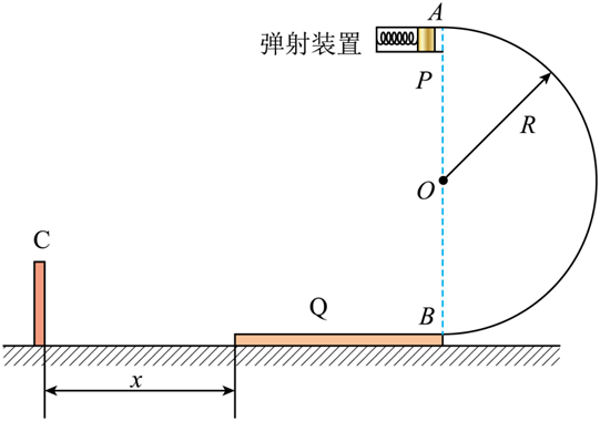 如图所示,光滑半圆形轨道 $A B$ 坚直固定放置,轨道半径为 $R$(可调节),轨道最高点 $A$ 处有一弹射装置,最低点 $B$ 处与放在光滑水平面上足够长的木板 $Q$ 上表面处于同一高度,木板左侧 $x$ 处有一固定挡板 C( $x$ 未知)。可视为质点的物块 $P$ 压缩弹射装置中的弹簧,使弹簧具有弹性势能 $E_p, P$ 从 $A$ 处被弹出后沿轨道运动到 $B$ 处时的速度大小始终为 $v_B=6 \mathrm{~m} / \mathrm{s}$ ;已知 $P$ 的质量 $m=1 \mathrm{~kg}, Q$ 的质量 $M=2 \mathrm{~kg}, P 、 Q$ 间的动摩擦因数 $\mu=0.3, Q$ 与 $C$ 之间的碰撞为弹性碰撞,忽略空气阻力,重力加速度 $g=10 \mathrm{~m} / \mathrm{s}^2$ 。
