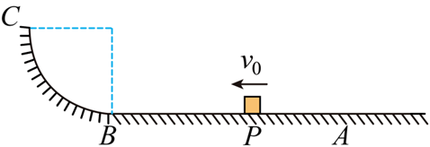 如图所示,在坚直平面内有一粗糙程度处处相同的轨道,由水平 $A B$ 和四分之一圆弧 $B C$ 两部分相切构成。一质量为 $m_0$ 的物块从轨道 $A B$ 上的 $P$ 点以水平速度 $v_0$ 向左运动,恰好到达 $C$ 点,而后又刚好滑回到 $P$ 点。若换成质量为 $m$ 、材料相同的物块,仍从 $P$点以水平速度 $v_0$ 向左运动,物块均可视为质点,则