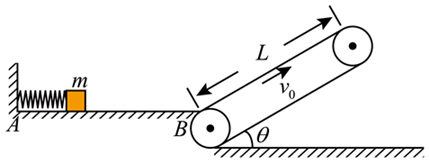 某种弹射装置如图所示,左端固定的轻弹簧处于压缩状态且锁定,弹簧具有的弹性势能 $E_p=9 \mathrm{~J}$ ,质量 $m=2 \mathrm{~kg}$ 的滑块静止于弹簧右端,光滑水平轨道 $A B$ 的右端与倾角 $\theta=30^{\circ}$的传送带平滑连接,传送带长度 $L=12 \mathrm{~m}$ ,传送带以恒定速率 $v_0=8 \mathrm{~m} / \mathrm{s}$ 顺时针转动。某时刻解除锁定,滑块被弹簧弹射后滑上传送带,并从传送带顶端滑离落至地面。已知滑块与传送带之间的动摩擦因数 $\mu=\frac{\sqrt{3}}{2}$ ,轻弹簧的自然长度小于水平轨道 $A B$ 的长度且滑块可视为质点,重力加速度 $g$ 取 $10 \mathrm{~m} / \mathrm{s}^2$ 。