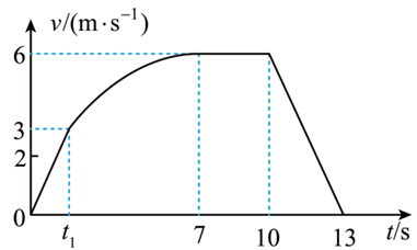 为登月探测月球,上海航天局研制了"月球车"。某探究性学习小组对"月球车"的性能进行研究。他们让"月球车"在水平地面上由静止开始运动,并将"月球车"运动的全过程记录下来,通过数据处理得到如图所示的 $v-t$ 图像,已知 $0 \sim t_1$ 段为过原点的倾斜直线;$t_1 \sim 10 \mathrm{~s}$ 内"月球车"牵引力的功率保持与 $t_1$ 时刻相同不变,且 $P=1.2 \mathrm{~kW} ; 7 \sim 10 \mathrm{~s}$ 段为平行于横轴的直线;在 10 s 末停止遥控,让"月球车"自由滑行,整个过程中"月球车"受到的阻力大小不变。下列说法错误的是