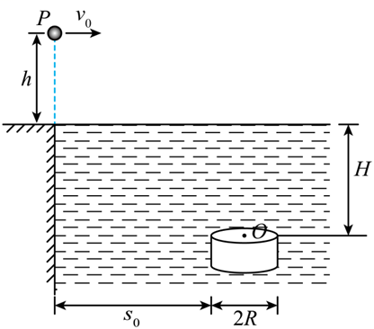 如图所示,点 $P$ 在水面上方 $h$ 高处,水缸的缸口离水面距离为 $H$ ,缸口的圆心为 $O$ 、半径为 $R$ ,点 $P$ 到缸口的水平距离为 $s 0$ 。在过 $O$ 点的坚直平面内,质量为 $m$ 的小球从 $P$ 点以不同初速度水平抛出,在下落到缸口高度前均能达到稳定状态。已知小球在水中运动过程中受到的浮力恒为 $F$ ,受到水的粘滞阻力 $f$ 与速度 $v$ 的关系为 $f=k v$(比例系数 $k$ 已知),方向与速度方向相反。不计空气阻力和缸口厚度,重力加速度为 $g$ 。