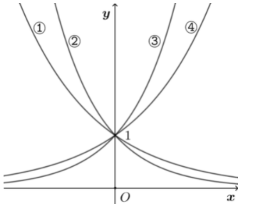 如图是指数函数(1) $y=a^x$ ,(2) $y=b^x$ ,(3) $y=c^x ,$ (4) $y=d^x$ 的图像,则 $a , b , c , d$ 与 0 和1的大小关系是