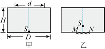 如图甲所示, 直径为 $D$ 、深度为 $H$ 的圆柱形容器内充满某种透明液体, 在其底部正中央 放置二点光源 $S$, 从液面上方看, 直径为 $d$ 的液面被光源照亮, 某物理兴趣小组想要让光 源能够照亮容器的整个液面, 在容器底部中央镶嵌二直径为 $L$ 的圆形平面镜 $M N$ (上表面 与容器底上表面齐平), 并把光源向上移动一段距离 $h$, 如图乙所示, 则