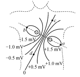 有研究表明, 当兴奋情绪传播时, 在人的体表可以测出与之对应的电势变化. 某一瞬间人体表面的电势分布图如图所示, 图中实线为等差等势面, 标在等势面上的数值分别表示该等势面的电势, $a 、 b 、 c 、 d$ 为等势面上的点, 该电场可等效为两等量异种电荷产生的电场, $a 、 b$ 为两电荷连线上对称的两点, $c 、 d$ 为两电荷连线中垂线上对称的两点. 下列说法中正确的是